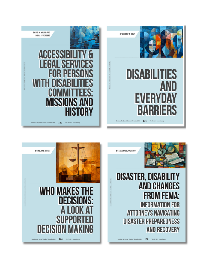 The Louisiana State Bar Association’s publication, the Louisiana Bar Journal, is a bimonthly magazine containing substantive law articles and Association news. The October/November 2024 edition, “Focus on Accessibility and the Law,” that featured articles by DRLA attorneys and advocates,