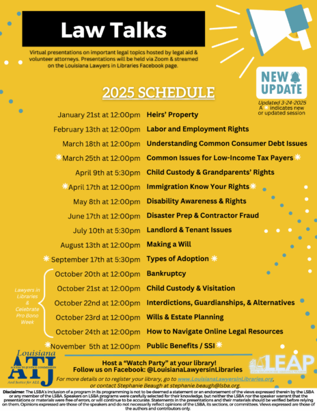 For more details on this series, a list of upcoming Law Talks events, or to register your library, go to www.LouisianaLawyersinLibraries.org.