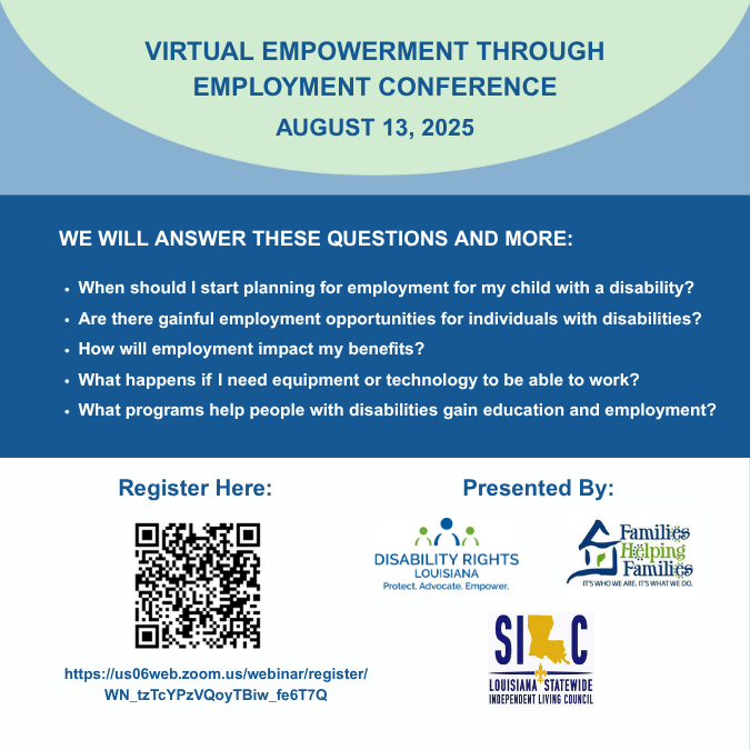 1. Graphic with sea green and dark blue theme with text that reads: Virtual Empowerment through Employment Conference August 13, 2025 WE WILL ANSWER THESE QUESTIONS AND MORE: * When should I start planning for employment for my child with a disability? * Are there gainful employment opportunities for individuals with disabilities? * How will employment impact my benefits? * What happens if I need equipment or technology to be able to work? * What programs help people with disabilities gain education and employment? Register here: https://us06web.zoom.us/webinar/register/WN_tzTcYPzVQoyTBiw_fe6T7Q Graphic contains QR code leading to the link above. At bottom right under text reading "presented by" are the logos for Disability Rights Louisiana, Families Helping Families, and the Louisiana Statewide Independent Living Council